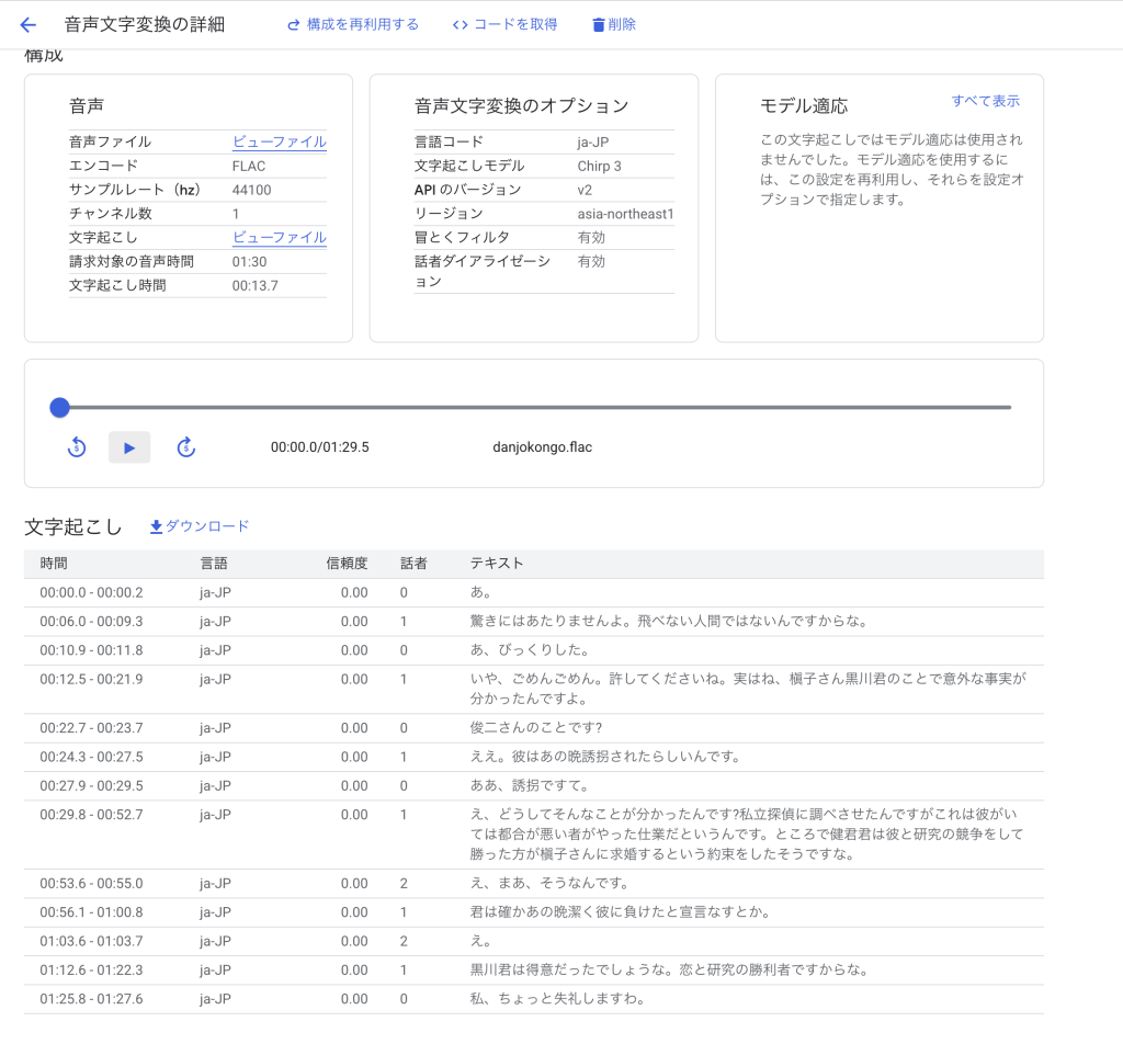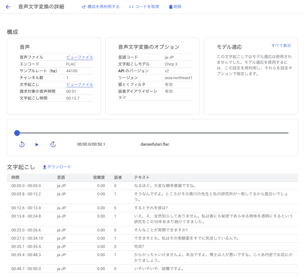 • 00:05.8 – 00:12.2で「説」を「先生」と誤って文字起こししていたが、それ以外は完璧に文字起こしできていた