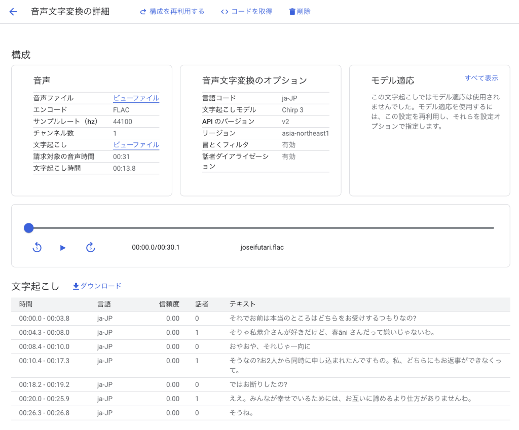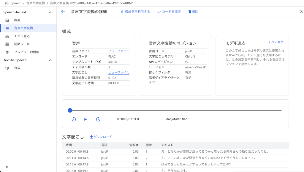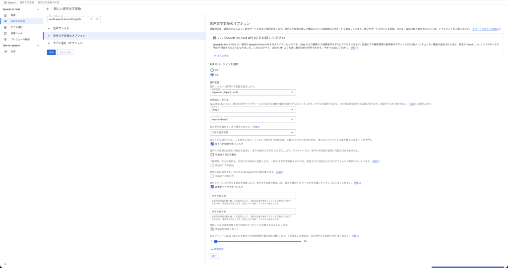 Chirp3※は、Googleによって開発された最新の多言語自動音声認識(ASR)専用生成モデルです。以前の Chirp モデルよりもASR精度と速度が大幅に向上され、また、話者ダイアライゼーションと多言語音声の自動言語検出が可能になりました。