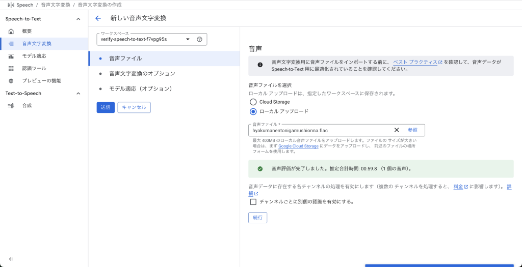 Cloud Speech-to-Text コンソールにアクセスし、音声ファイルをアップロードします。