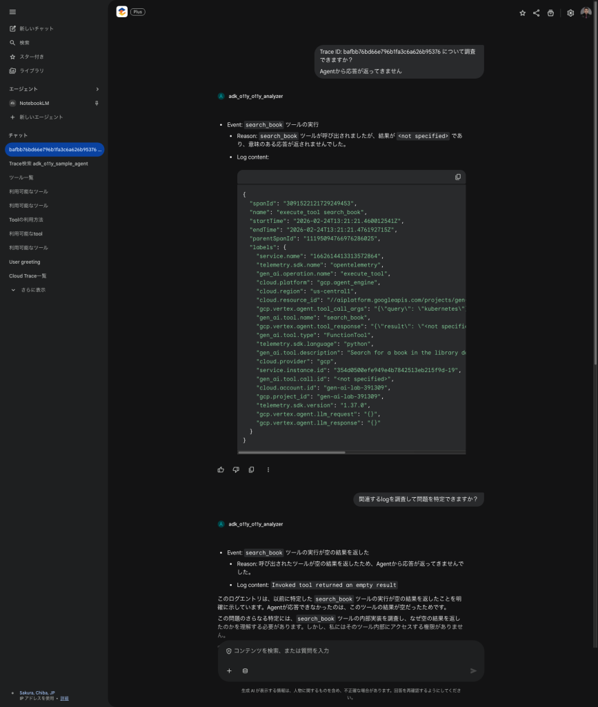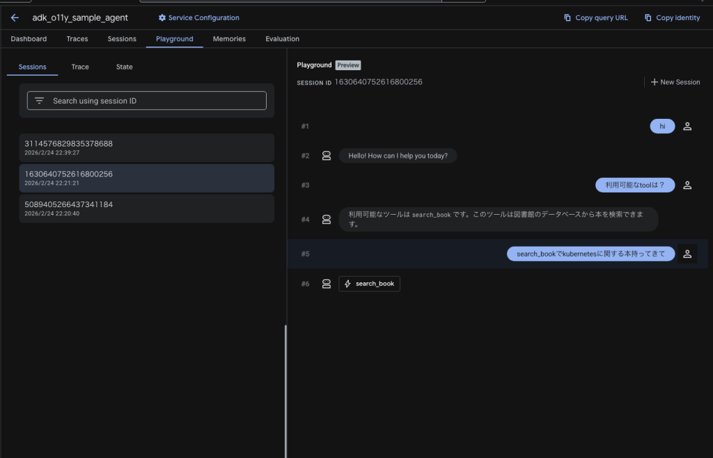 AgentをAgent EngineにDeployします。Vertex AI Agent Engine の Playground で sample_agent を開き、Toolが使われる質問を投げます。この時点で、Cloud Logging / Cloud Trace 側に失敗イベントが蓄積されます。