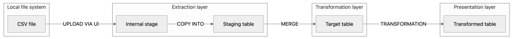 本記事ではSnowflakeの機能のみを使って最低限のデータパイプラインを作成する方法をご紹介します。流れとしては、CSVファイルからSnowflakeにデータをインジェストし、生のデータをレポートに必要なターゲットデータモデルに変換し、そのパイプラインを自動化します。