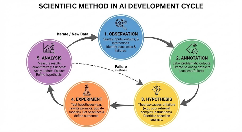 AI開発における科学的手法は、観察(Observation)、アノテーション(Annotation)、仮説(Hypothesis)、実験(Experiment)、分析(Analysis)というサイクルであると提唱されています(参考)。