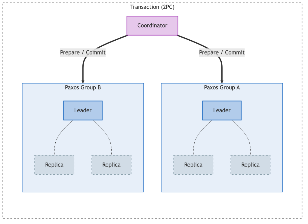 これに対して,Spanner の 2PC における参加者は Paxos Group (i.e. 複数台のチーム) であり,チーム内の誰かがダウンしても,過半数が生きていればチームとしては正常に稼働し続けます.つまり Spanner は,2PC の最大の弱点である可用性の低さを Paxos の強靭さでカバーすることで,止まらない 2PC を実現しているわけです.