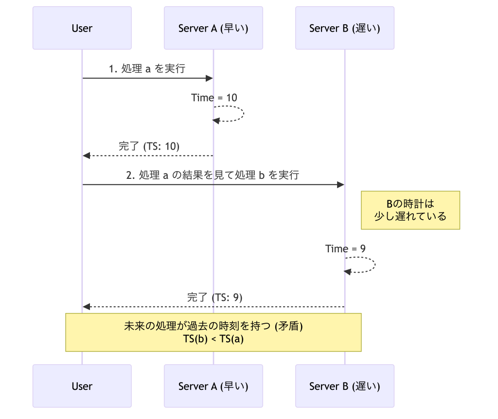 - これにより「b は a の後に起きたのに,タイムスタンプは b の方が古い」という矛盾が発生