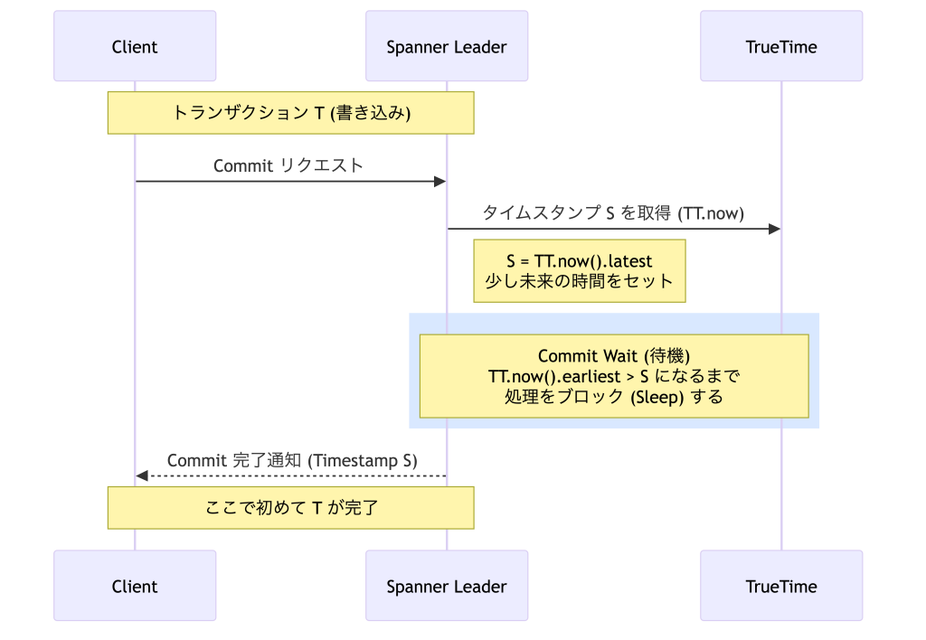 TrueTime API が提供するのは,曖昧さを残した「幅のある現在時刻」に過ぎません.この不確実性を抱えたまま,Cloud Spanner はどのように厳密な整合性 (外部整合性) を守っているのでしょうか? それは「Commit Wait (コミット待機)」という愚直な方法です.