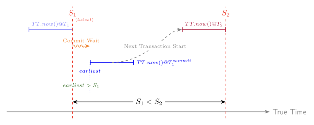 Cloud Spanner は T_2 のタイムスタンプ (S_2) を決定する際,その時点の不確実な区間の「未来側 (latest)」を採用していました.つまり S_2 は,必ずその瞬間の実時間以上の値になります.