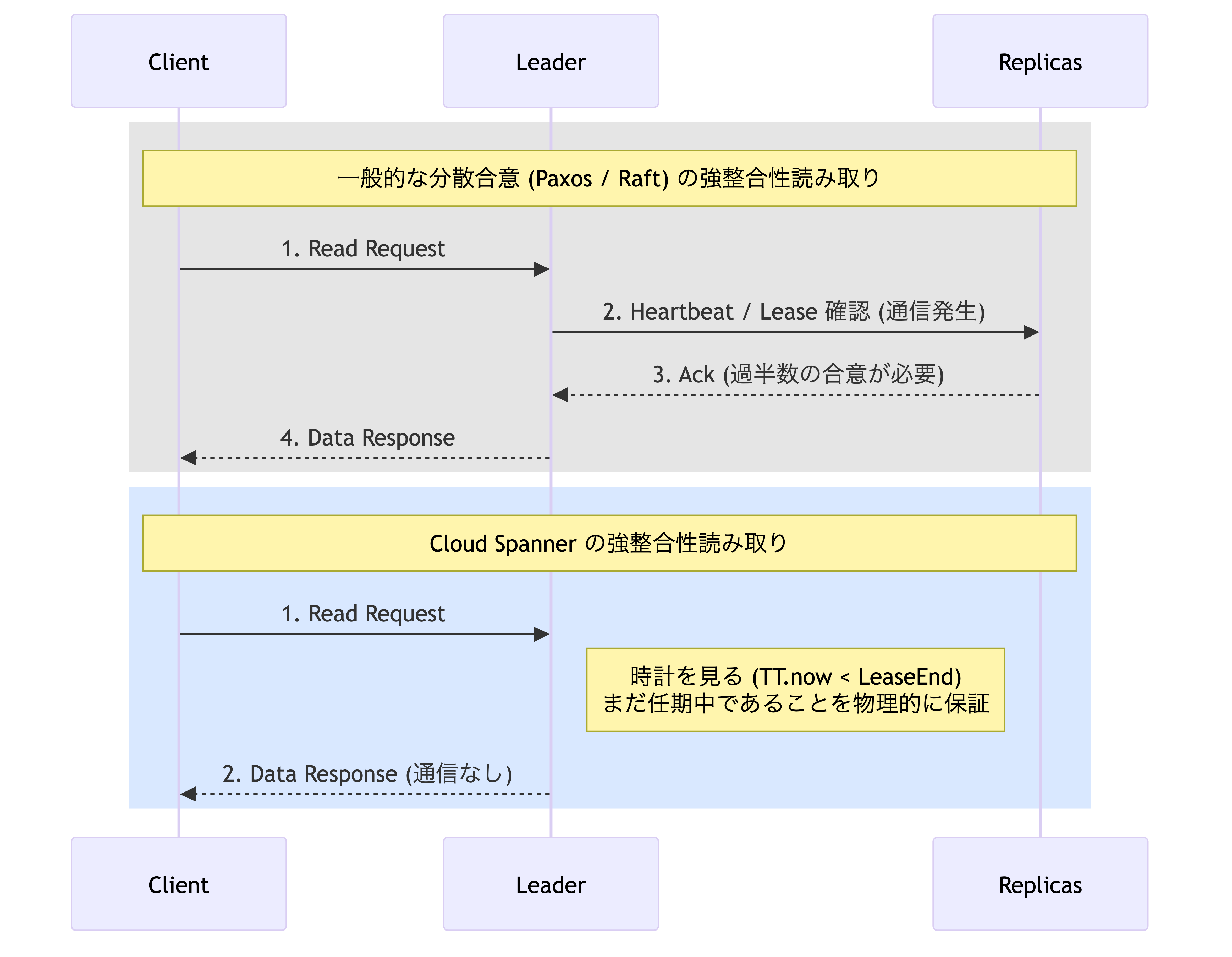 通常,分散システム (Paxos) で厳密な最新データを読み取るには,リーダーが「自分が今もリーダーであること (Leader Lease)」を過半数のメンバーに通信して確認する必要があります. ところが Spanner は,ここでも TrueTime の精度を利用します.リーダーは自分の手元の時計を見て Lease 期間内であれば,誰にも確認せず即座にメモリからデータを返します.