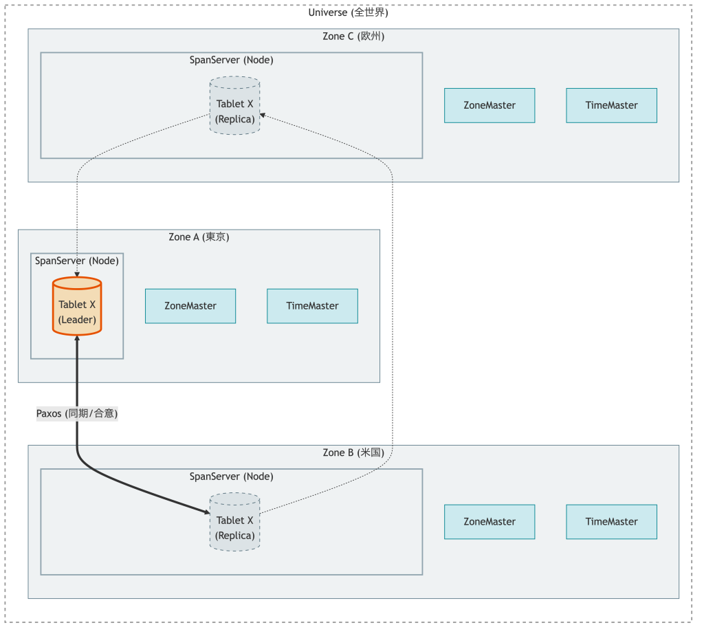 Spanner は,分割されたデータ単位である Tablet を,常に複数の Zone (通常 3 つ以上) へ複製することで可用性を担保しています.この分散したレプリカ間で整合性を保つために採用されたのが,分散合意アルゴリズムとして実績のある Paxos です.