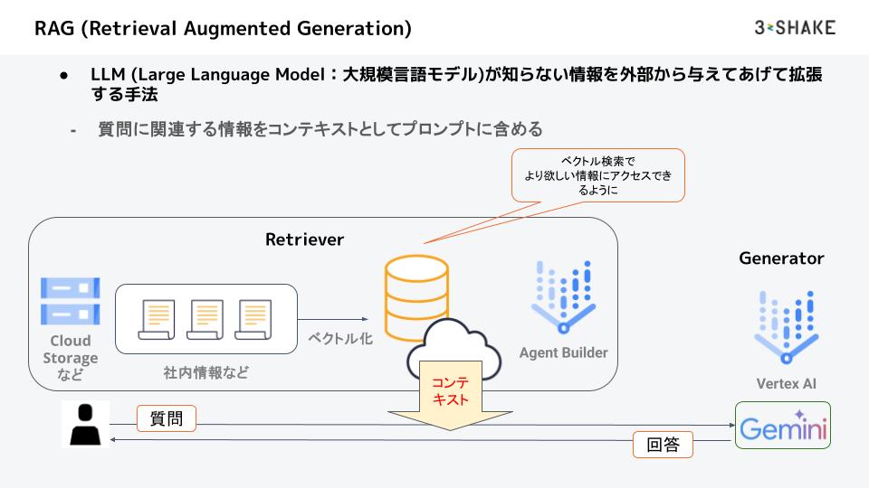 - RAGとは、GeminiなどLLM (Large Language Model:大規模言語モデル) が知らない情報を外付けして、それらの情報に関する質問にも答えさせられるようにする手法です。