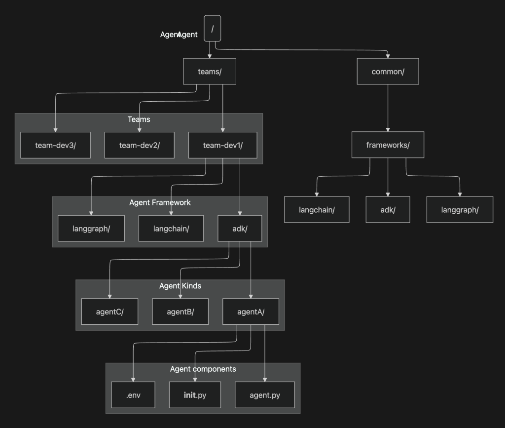 adk/,langchain/,langgraph/)を設け、その中にエージェントごとのコードを配置します。 - 各エージェントは