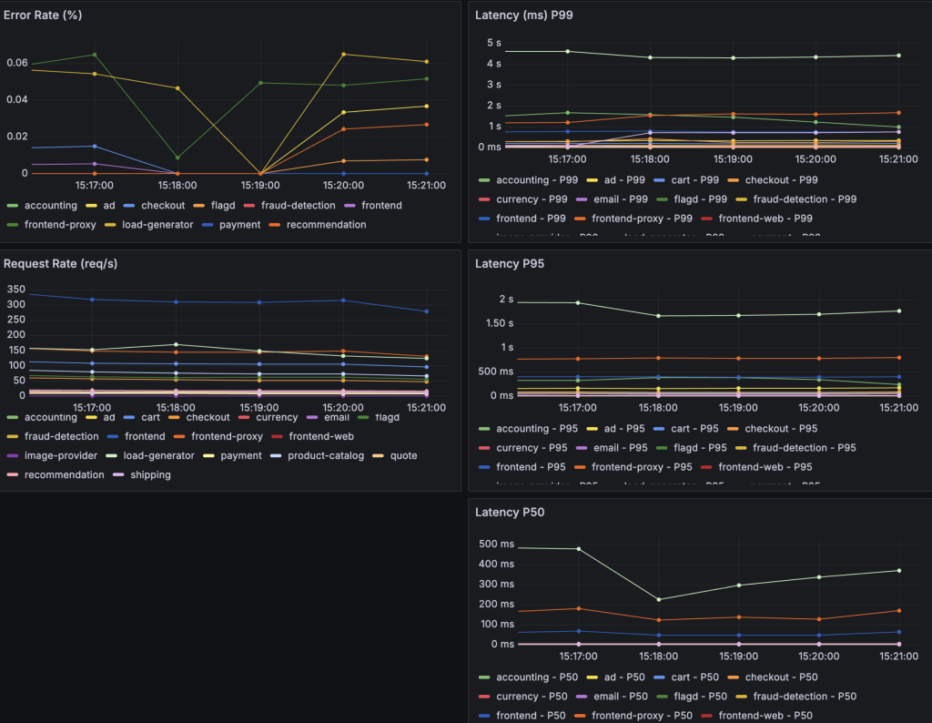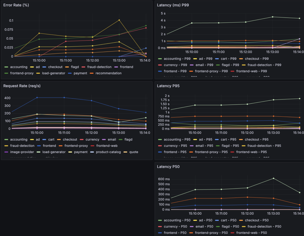 • パーセンタイルレイテンシ(P95, P99): 平均応答時間は異常値を丸めてしまいます。前リクエストのうち最も遅い上位5%, 1%の動きを見ることで一部の通信が詰まっている兆候を早期に検知できます。
