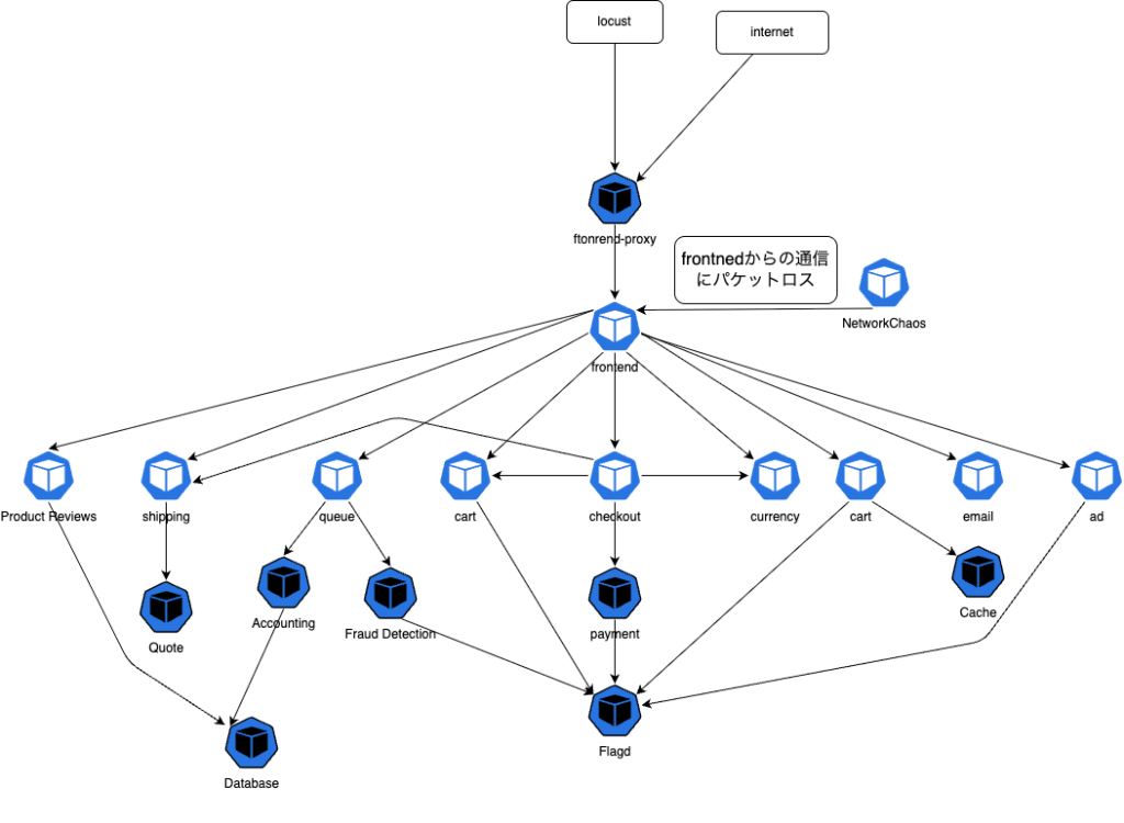 ネットワークでパケットが失われる場合、システムがどのように振る舞うのかを検証しました。今回の実験では、エラー率とレイテンシーをLocustでリクエストを自動で送って確認しました。仮想のユーザを1000人まで、1秒に10人増やすように設定しています。frontendからの通信にパケットロスが起こるように設定しました。