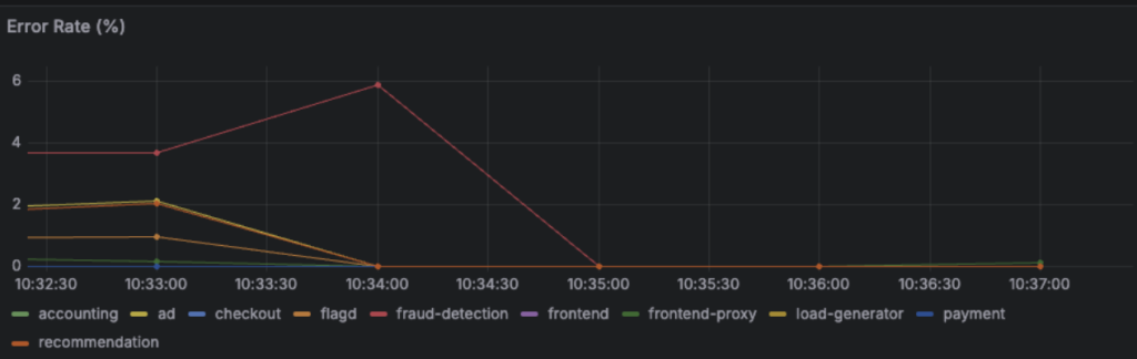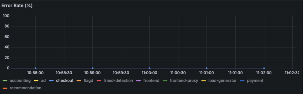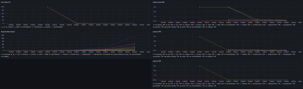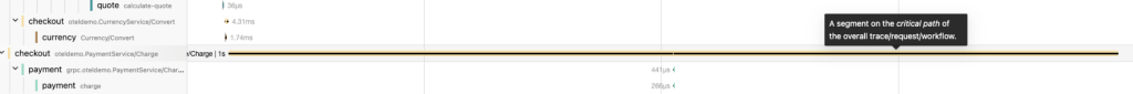 1000msの遅延では、決済時に不快に思う遅延を感じられました。また、Jaeger側で”A segment on the critical path of the overall trace/request/workflow”と表示されました。これは、checkoutからpaymentへのスパンがトレースの全体の処理時間を決定していることを意味します。1000msの遅延によって、全体に影響を及ぼしていることがわかりました。また、1000msの遅延ではエラーが出ないことがわかりました。