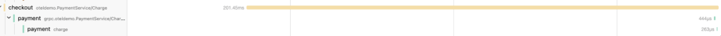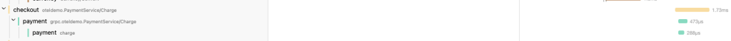 トレースが約50ms、checkoutのスパンが1.73ms,paymentのスパンが473μs