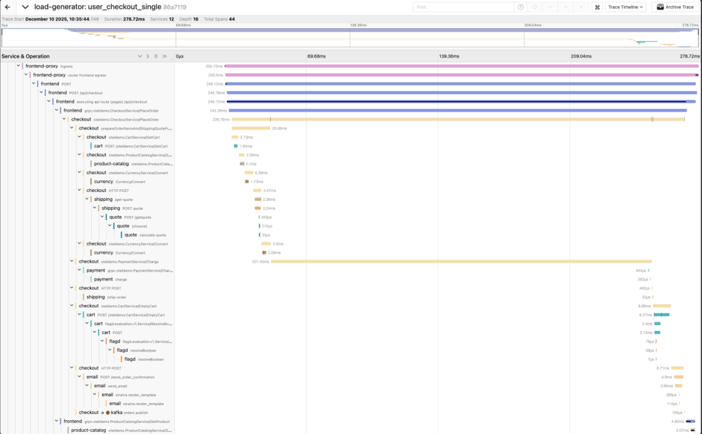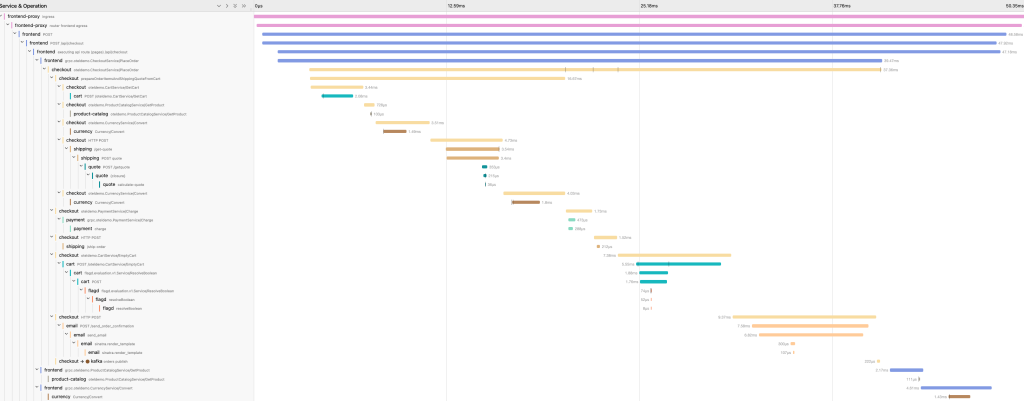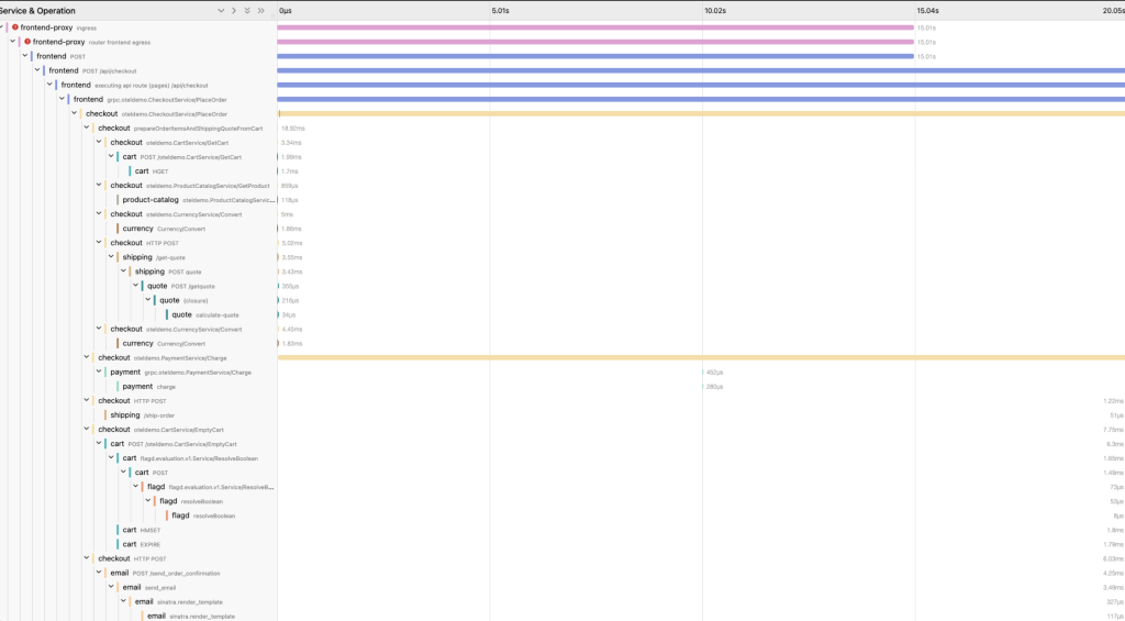 • スパン(Span): トレースを構成する個々の処理単位(例: checkoutサービスからpaymentサービスへの通信)
