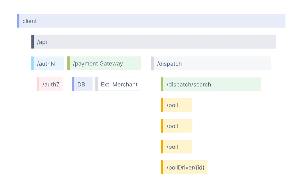 画像で言うと、この一連のリクエストの流れをトレースといい、個々の処理をスパンと言います。