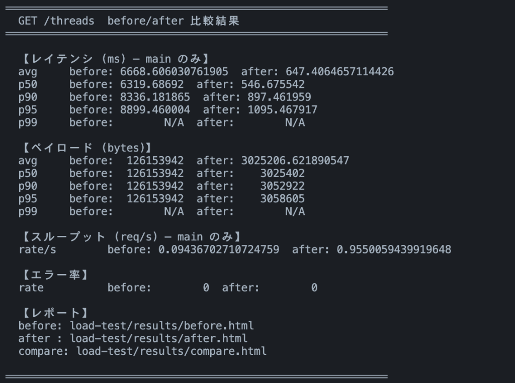 また、GET /threads 単体の計測しかしていないので、他のエンドポイントや同時に走るバッチ処理との干渉は見えていません。次にやるなら、本番のログから実際のレイテンシ分布を取得して、ローカル計測との差分を確認したいと思っています。
