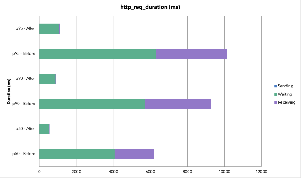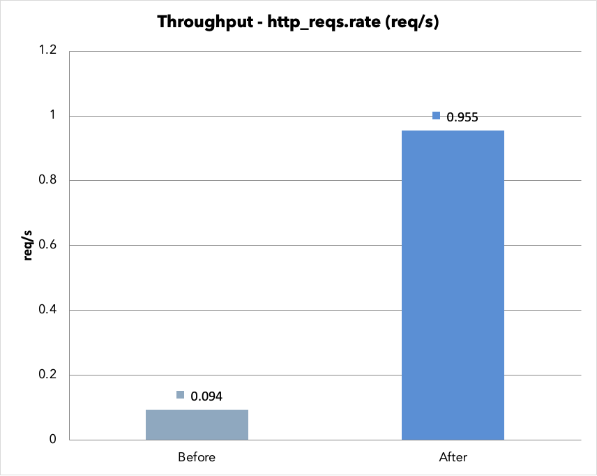 v2 で Before のペイロードが v1 より大きくなっているのは、v1 ではリクエストの大半がタイムアウトで打ち切られて不完全なレスポンスだったのに対し、v2 ではすべてのリクエストが正常完了して全データが返ってきたためです。