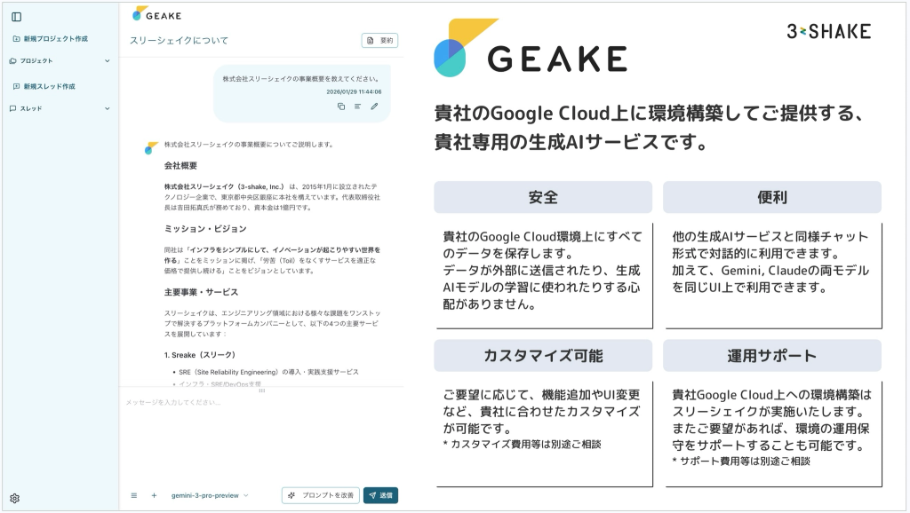 Geake は、お客様の Google Cloud 環境上に構築・提供する法人専用の生成 AI サービスです。すべてのデータがお客様の環境内に閉じるためセキュリティ面で安心でき、Gemini と Claude の両モデルを同一 UI で利用できるのが特徴です。機能追加や UI 変更などのカスタマイズにも対応しています。