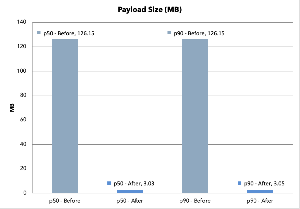 ペイロードサイズの差はさらに大きく、Before は 1 リクエストあたり約 126 MB のレスポンスを返していました。1,000 スレッド × 30 メッセージ × 各メッセージの添付ファイル・生成ファイルがすべて含まれていたためです。After ではこれが約 3 MB まで削減されました。