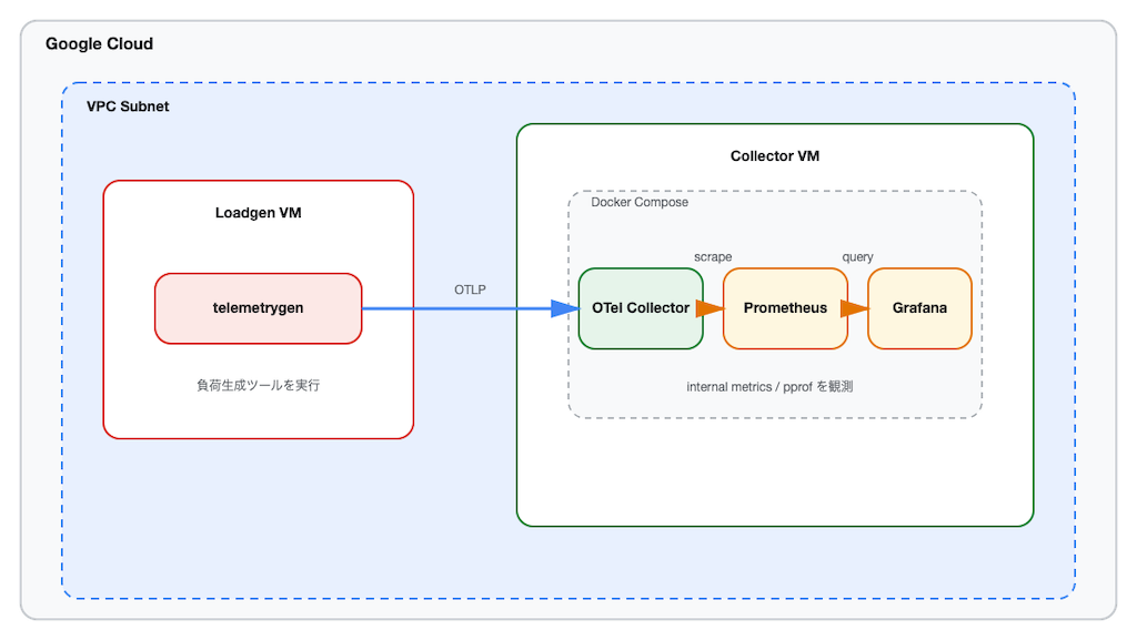 本記事のデータは Google Cloud 上で取得しました。Loadgen VM と Collector VM の 2 インスタンス構成で、負荷生成と Collector を分離しています。本文では、取得済みのメトリクス、pprof、クライアントログをもとに、どのように原因を切り分けたかというデバッグの流れに絞って説明します。同じ環境で再現したい場合は GitHub リポジトリ を参照してください。