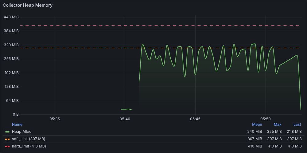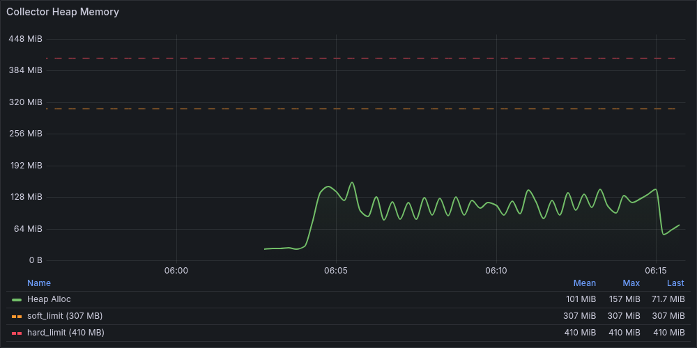 Heap は soft_limit を大きく下回る水準で安定しており、memory_limiter は一度も発火していません。