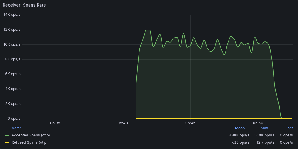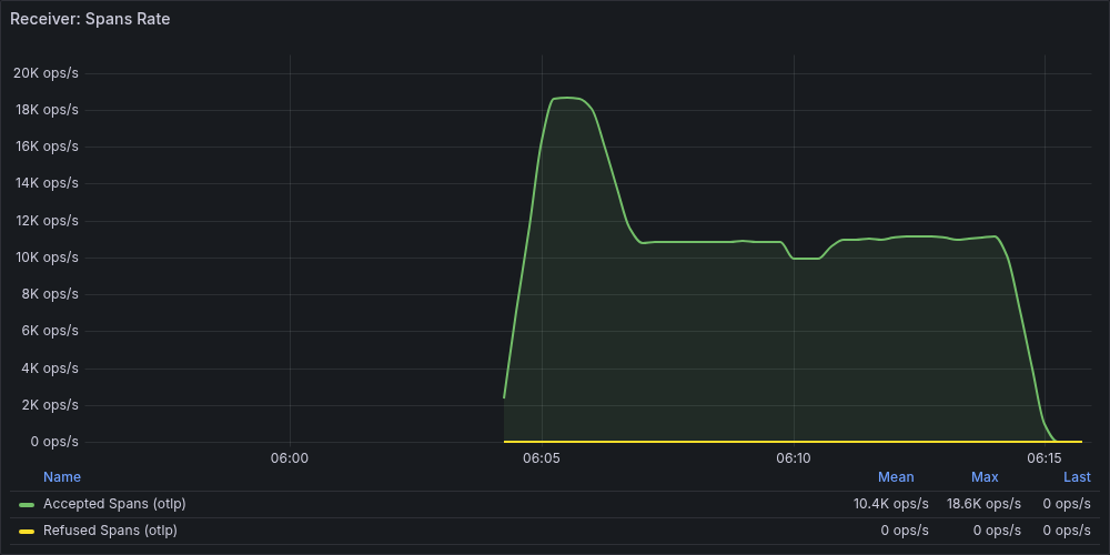 このグラフの縦軸はspans/secですが、telemetrygen --rate 2500はtraces/sec指定です。1 トレースあたり 11 spans(1 root + 10 child)なので、理論上の投入量は 27,500 spans/sec になります。また、telemetrygen の実測生成量は理論値の約 6 割(約95万 / 150万 traces)に留まりました。受信レートはこの実送信量に対しても低い水準です。