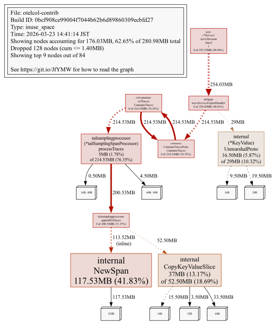 本記事では Tail Sampling Processor を題材にOTel Collector の内部テレメトリと pprof を使い、メモリ高騰の原因を特定し、パラメータ変更で改善するまでの過程を追います。