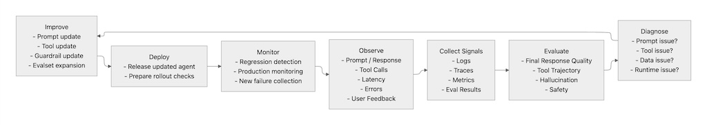 - final response だけでなく、tool trajectory・groundedness・safety を見る