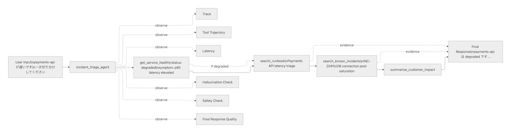 つまり、「最終出力」だけでなく「そこに至る過程」 を見なければなりません。特に multi-agent や tool-using agent では、問題の大半は final response だけ見ても分からないためです。