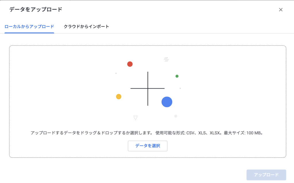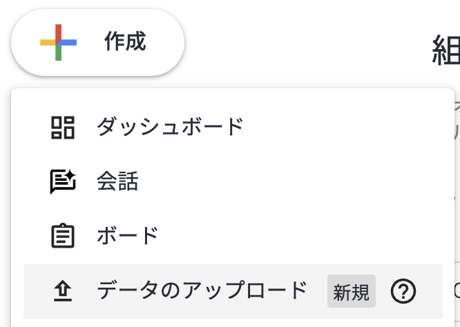 1. Lookerメインページの「+作成」を押し「データのアップロード」を選択します。