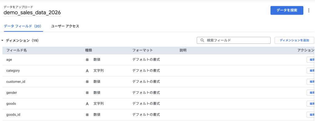 3.アップロードに成功すると、データ一覧を確認できます。dimensionやmeasureをここで設定できます。