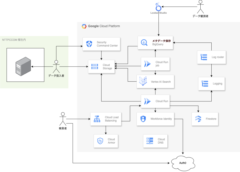 Vertex AI Search と Cloud Run Service、 Cloud Run Jobs、Workforce Identity、データの保存に firestore などを利用しました。大きく分けると、検索機能部分と裏側の運用部分に分かれます。