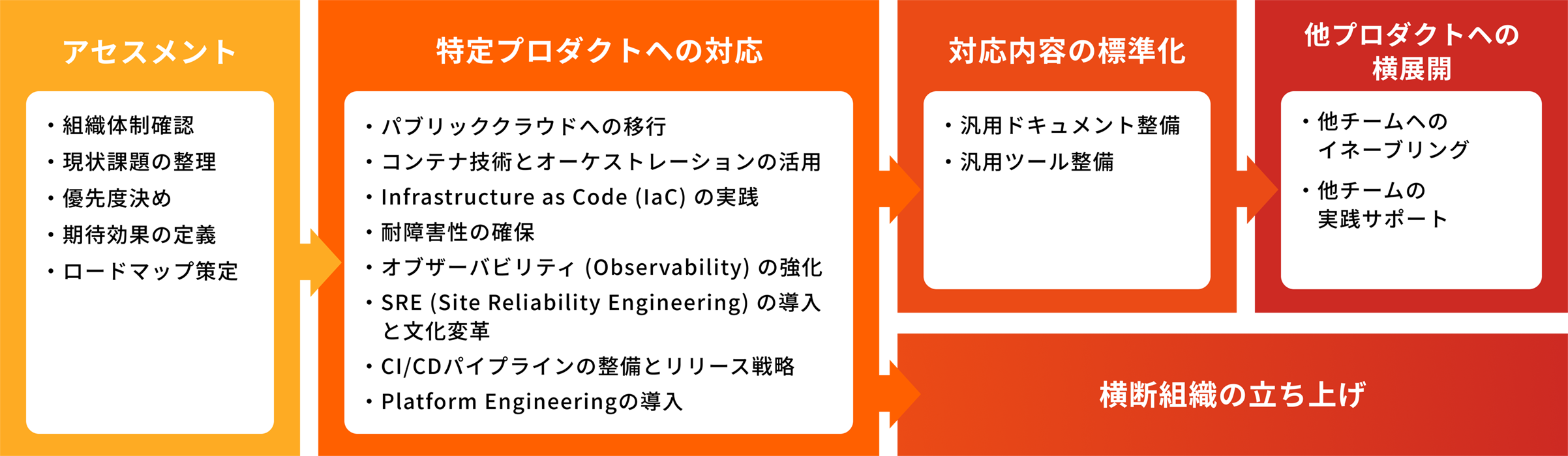 信頼性を維持しながら開発を進めるためのSRE導入戦略から、改善の実行まで全てのフェーズをシームレスにサポート可能です。